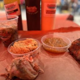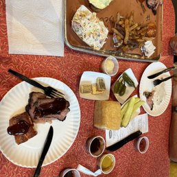 We tried Sugarfire on Washington in St. Louis. It's cafeteria style, you order at the kitchen counter then search for a table. 6 bottles of bbq sauces, roll of paper towels. They were out of white bread but had lots of cornbread to buy. We ordered family style so our group of 3 could try/share all the food. We had the brisket, pulled pork, ribs. We had the Cole slaw, beans, sauteed veggies, potato salad, & Mac & Cheese sides. Enjoyed all the sides, the veggies were southern style slow braised. Loved the brisket and pulled pork. We had two different ends of rib racks and 1 was dry & chewy lean. The other was juicy, tender and delicious. Overall the bbq was great we loved the St. Louie sweet and the coffee sauces the most. The bbq was good comfort food.